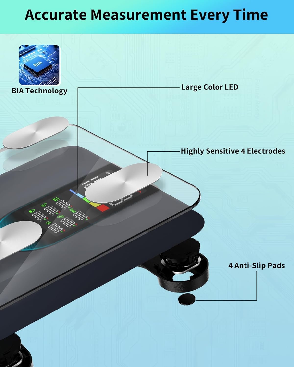 4-Electrode BIA Technology for Accurate Body Analysis – This smart scale for body weight uses a 4-electrode BIA system to estimate multiple body composition indicators, giving more detailed insights than a standard digital bathroom scale