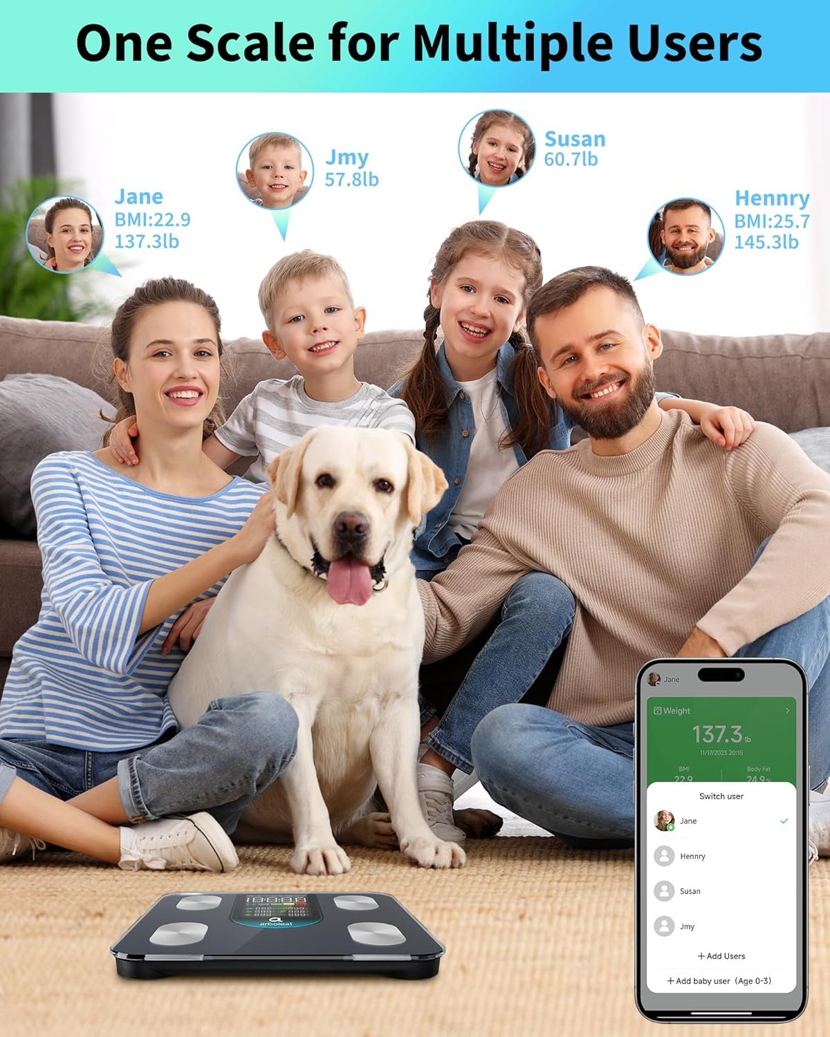 Multi-User Friendly Weight Scale – Supports unlimited users and up to 8 personal profiles with automatic recognition, making this smart bathroom scale ideal for families, couples and small fitness groups sharing one scale for body weight and fat