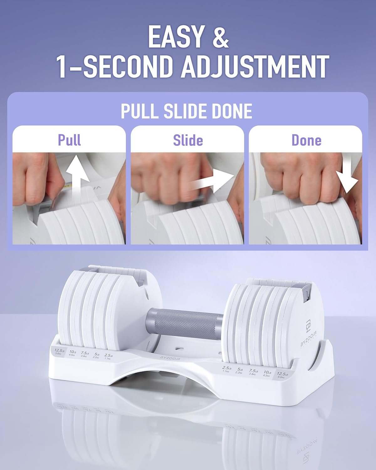 INNOVATIVE PATENTED DESIGN: Engineered with a customer-first approach, BYZOOM FITNESS adjustable dumbbells feature an internationally patented mechanism, making weight selection effortless. Designed to simplify strength training, this system ensures a smooth and user-friendly experience for all fitness levels.