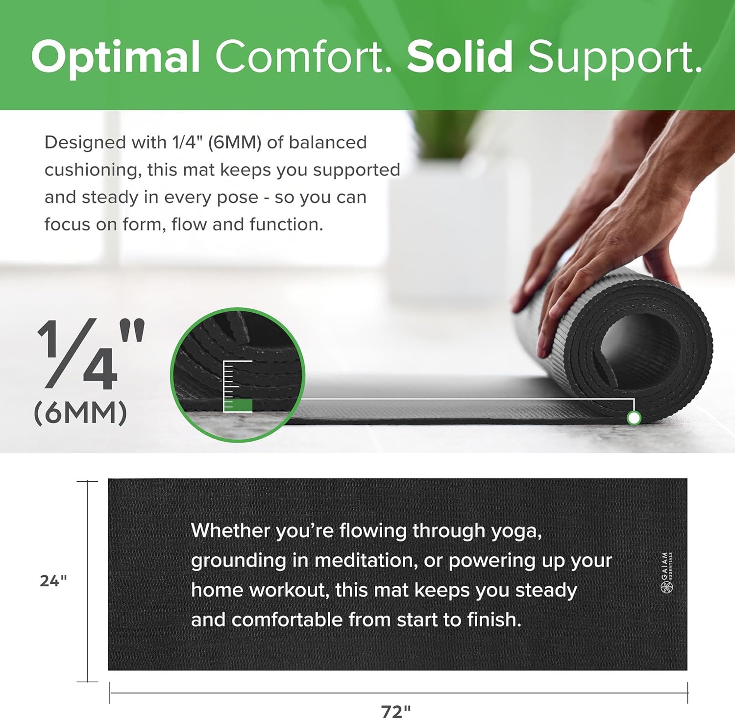 Gaiam Essentials Yoga Mats are the ideal classic yoga mat for all types of yoga, Pilates and floor exercises. These durable, yet lightweight exercise yoga mats are extra-thick (1/4 Inch) for the additional cushioning your joints need during any yoga or fitness routine. Featured in classic colors with a textured non slip surface for excellent traction and superior grip. A carrying sling/strap is included with the yoga mat so you can strap up your mat and go. 72″L x 24″W x 1/4 Inch (3.5 lbs).