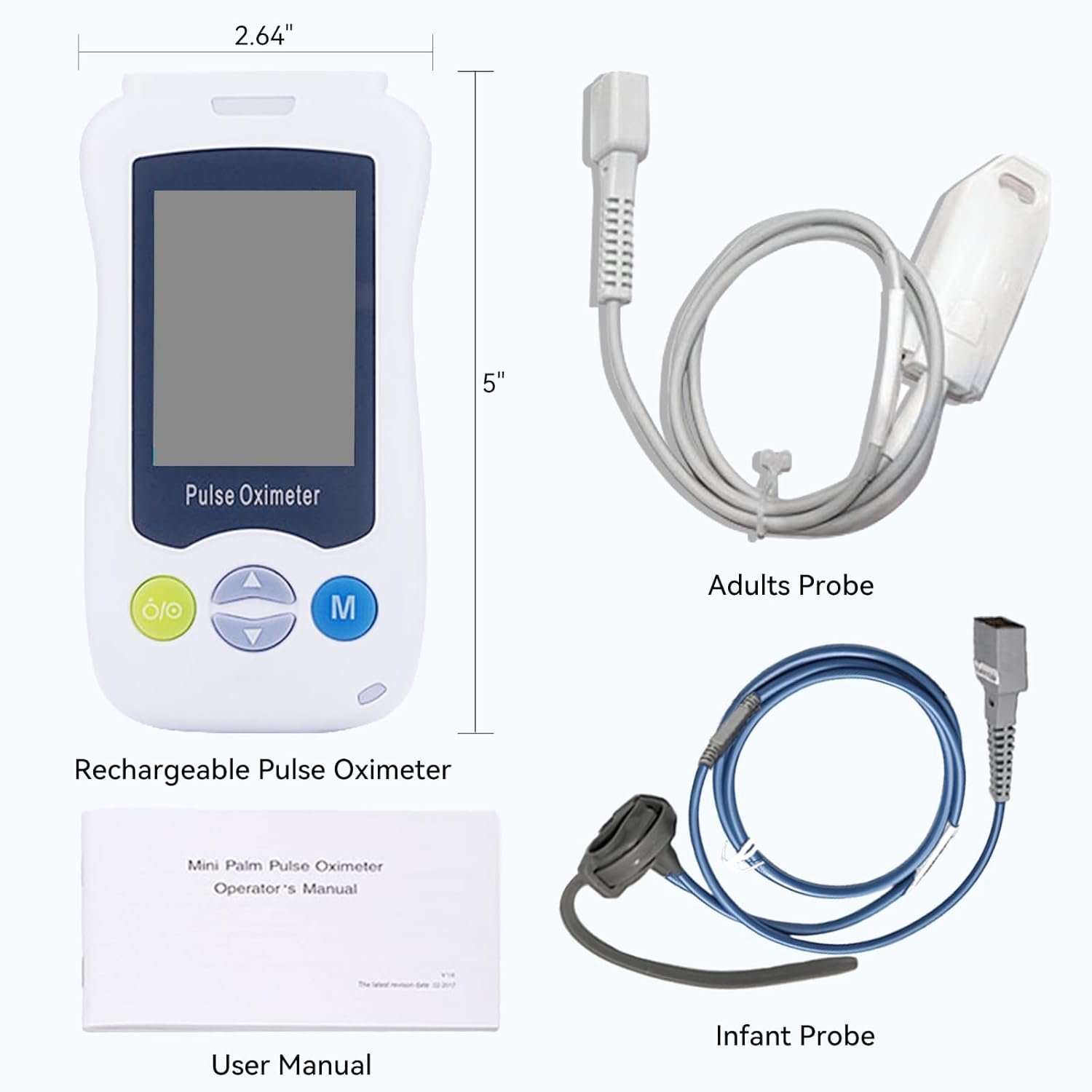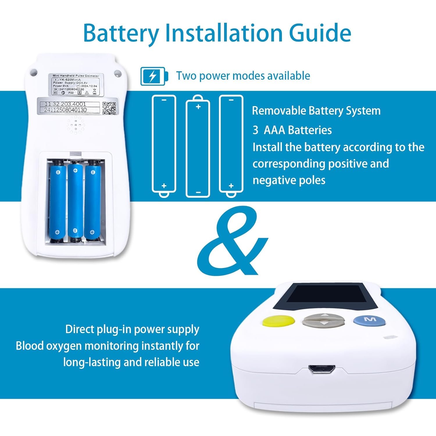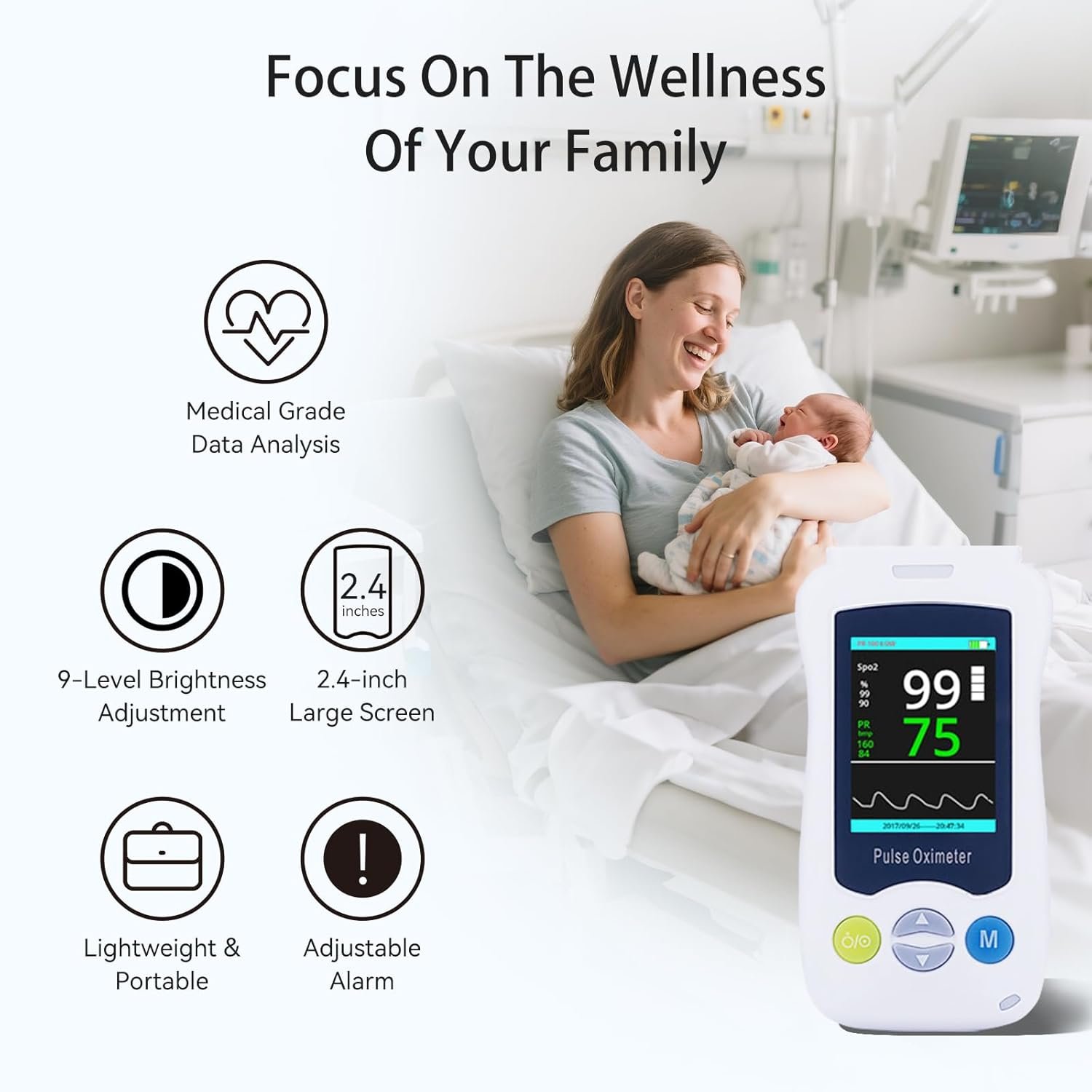 Easy to Use for the Whole Family: It has a flexible power supply method, supports AAA batteries for emergency use, and can be used anytime with data cable power supply, whether at home or outdoors. 2.4-inch high-definition large screen, 9-level brightness adjustable at will, data is not blurry under strong light during the day, and can be clearly seen even in weak light at night, presenting SpO2 and heart rate data clearly for you at all times. Suitable for adults and Individuals from 0 to 18 months old.
