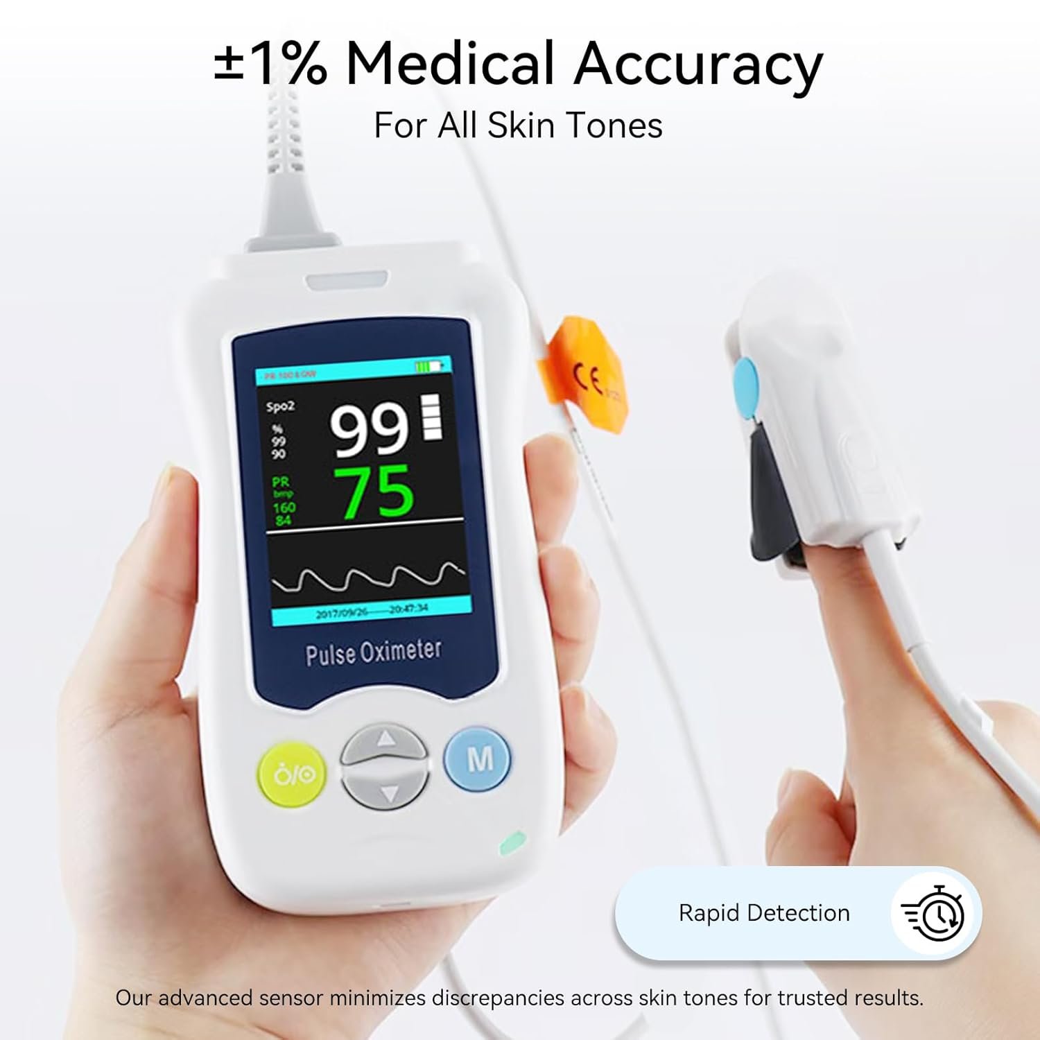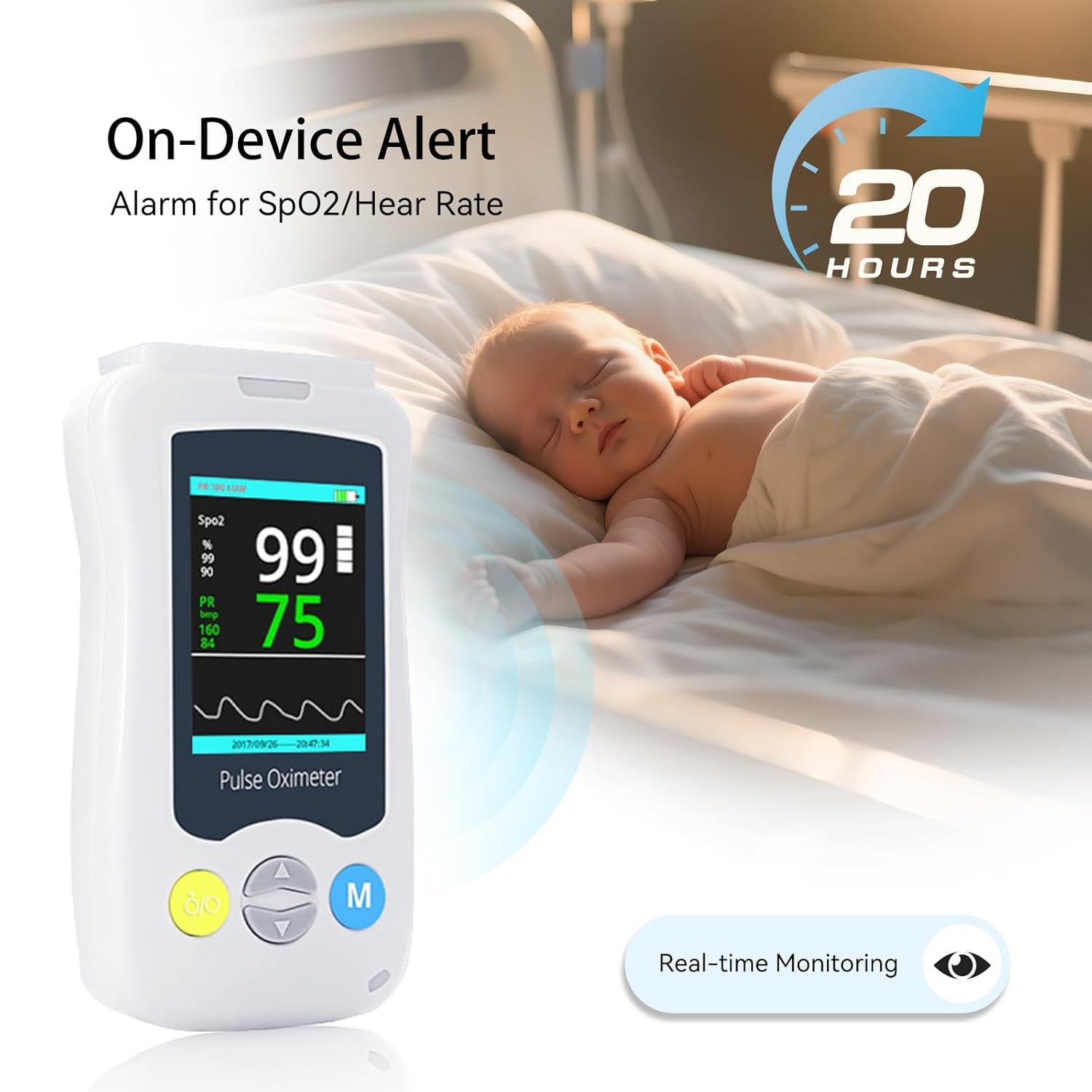 Handheld Pulse Oximeter, Can continuously monitor, Adjustable pulse and SpO2 level alarm, Equipped with overnight continuous monitoring and alarm function, Ideal for home use.