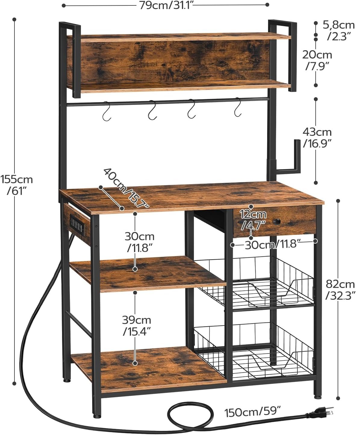 HOOBRO Bakers Rack with 4 AC Power Outlets, 5-Tier Coffee Bar with Wire Basket, Microwave Stand with Paper Holder and Drawer, Kitchen Storage Shelf, Rustic Brown and Black BF84UHB01