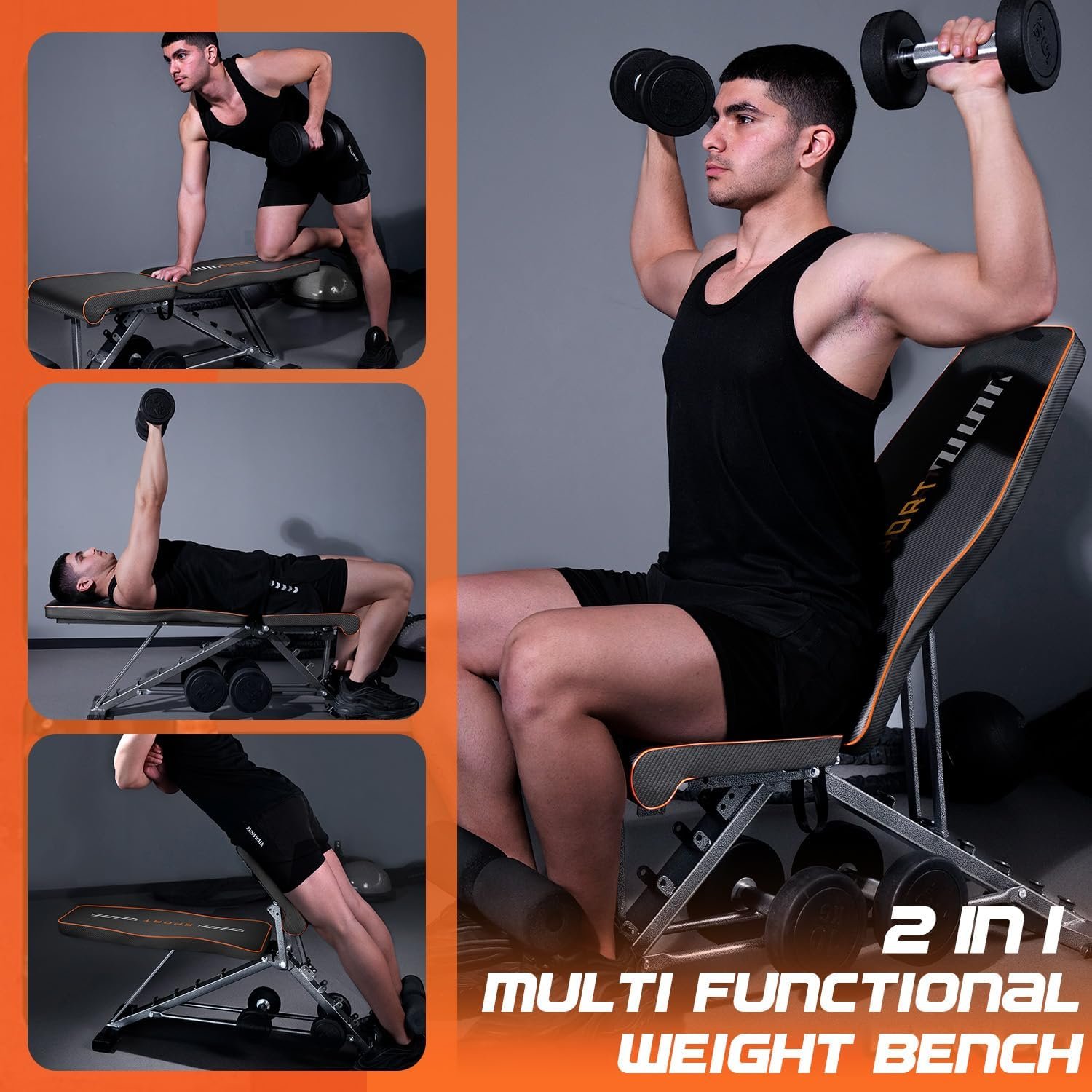 Foldable & Easy to Storage: KUYOU adjustable weight bench Designed with a handy folding feature and equipped with a carrying strap in the middle, it can be easily stored and moved even in homes with limited space, significantly saving room.