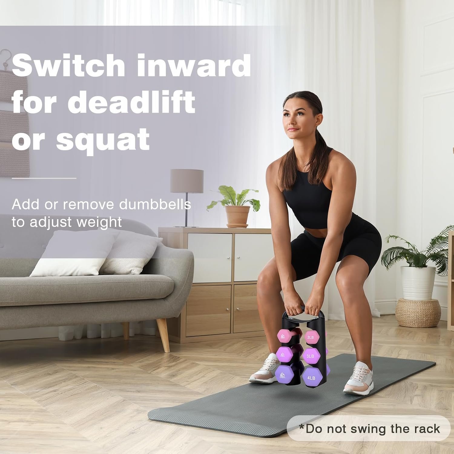 Creative Portable Multifunctional Dumbbell Rack: No assembly needed. Innovative design for easily switch between A-frame and H-frame by rotating the rack frames. Maximize your space in H-shape and take out dumbbells easily in A-shape. You can also do kettlebell workouts with all the dumbbells on it in H-shape. Ergonomic handle for easy carrying the whole set anywhere.