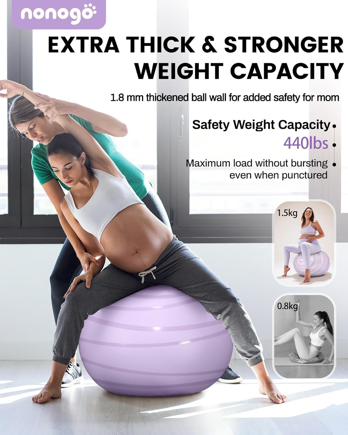💪【Extra Safety and Stability 】 With a maximum weight capacity of 440LB, the weight (1.5kg) and thickness (about 1.8mm) of these superior exercise ball compared to standard ones, providing extra stability and reducing the risk of slipping or bursting. Feel safe and supported during workouts, labor prep, or relaxation
