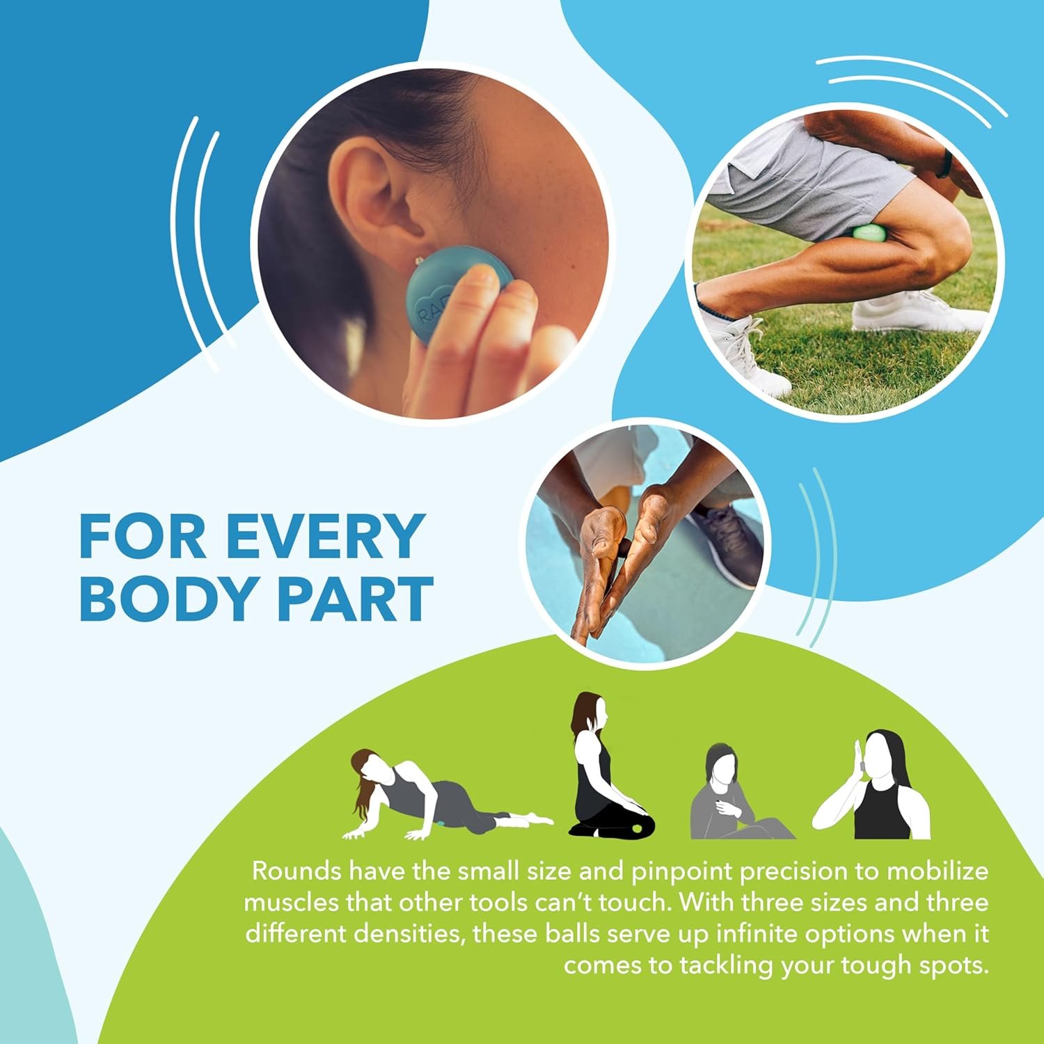 Three Sizes & Densities: Includes 3 therapy balls for customized pressure—Green (2.2” soft), Blue (1.6” medium), and Black (0.75” firm)—so you can match the right density to the right muscle.