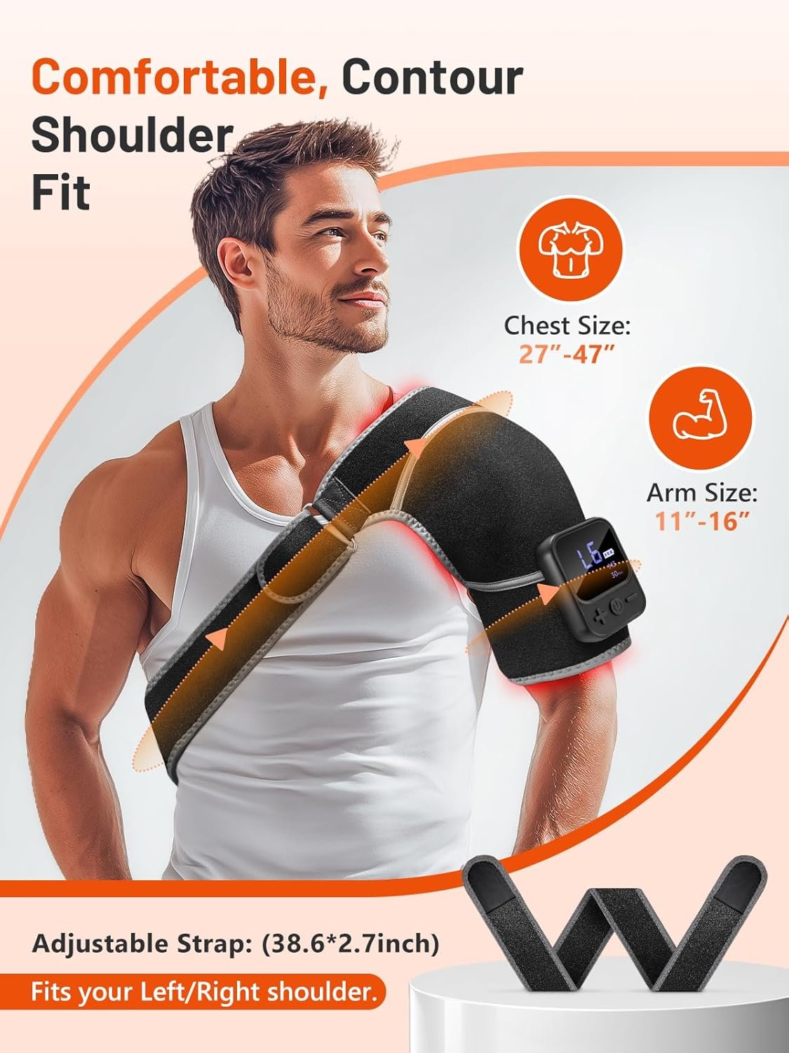【Ergonomic & Adjustable Design】Designed to fit the human shoulder’s curves, it features an adjustable strap with dual pull-rings and hook-and-loop fasteners, ensuring a comfortable fit for all body types and postures. The skin-friendly fabric is soft and flexible, conforming snugly to shoulder contours for a non-slip experience. Note: Effectiveness may vary with clothing color and thickness due to light absorption.