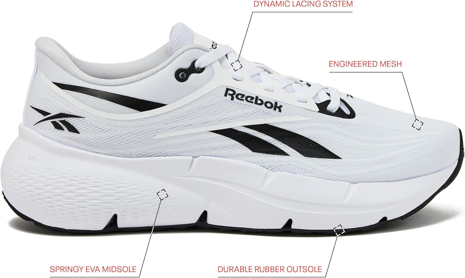 Meet the new shape of running, the high energy return Zigniton by Reebok. Providing comfort and support for runners of all levels and abilities, these mens running sneakers are packed with technology to ensure you make it to the finish line. The engineered mesh upper provides support and flexibility while the dynamic lacing system provides a locked in feel. The soft plush cushioned collar accentuates a premium and comfortable feel. The FuelFoam Plus EVA midsole in a Zig shape provides lightweight, responsive cushioning, while the innovative outsole disperses energy for enhanced cushioning from heel strike to toe-off. Available in neutral and bold colors in mens sneakers size 7-14.