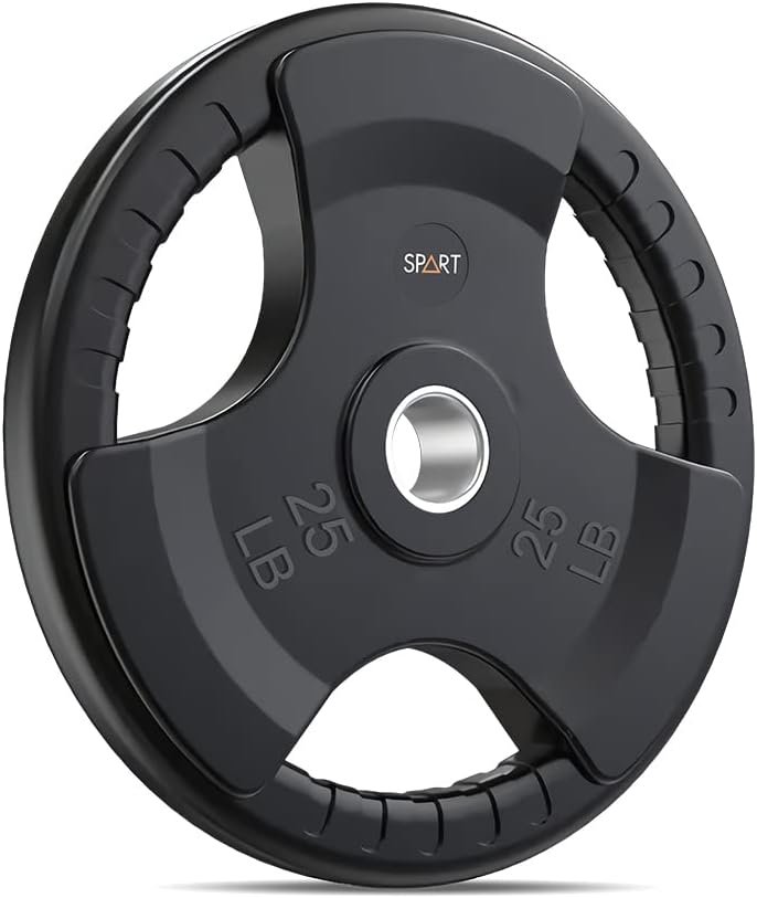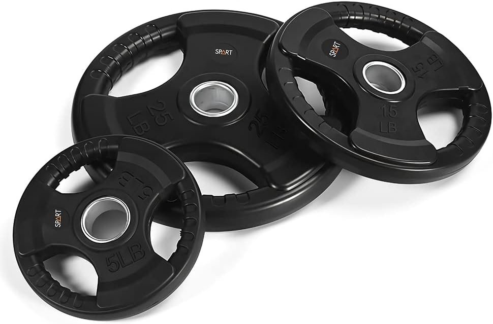 💪FEATURE: SPART weight plates have a solid iron core and slide rubber surface. This design can protect the floor from damage and ensure enough weight when you do exercise. The strong steel ring insert can help you assembly the barbell easily. The three holes are designed for grip according to your hands and you can do weightlifting exercise with single plate as well.