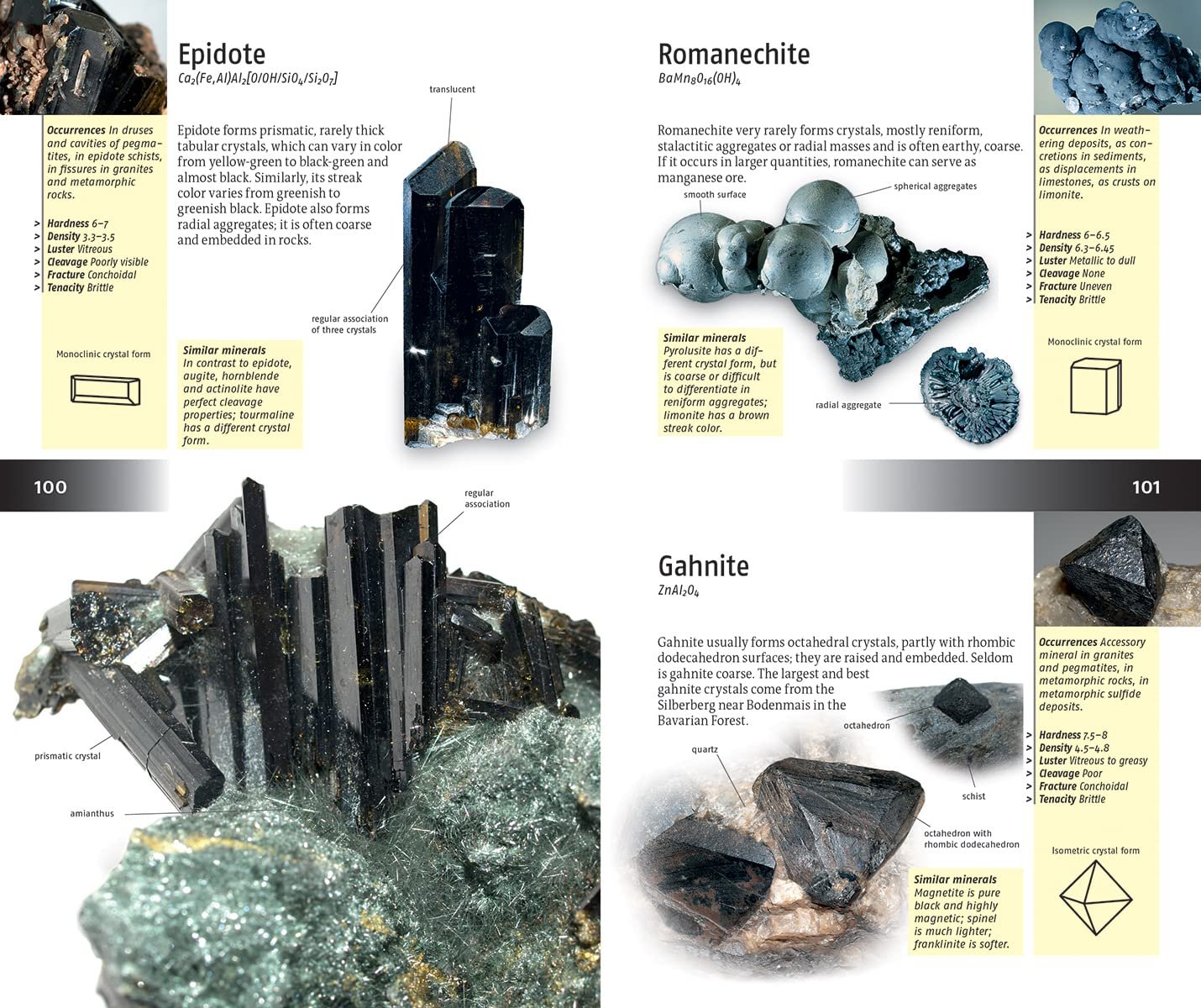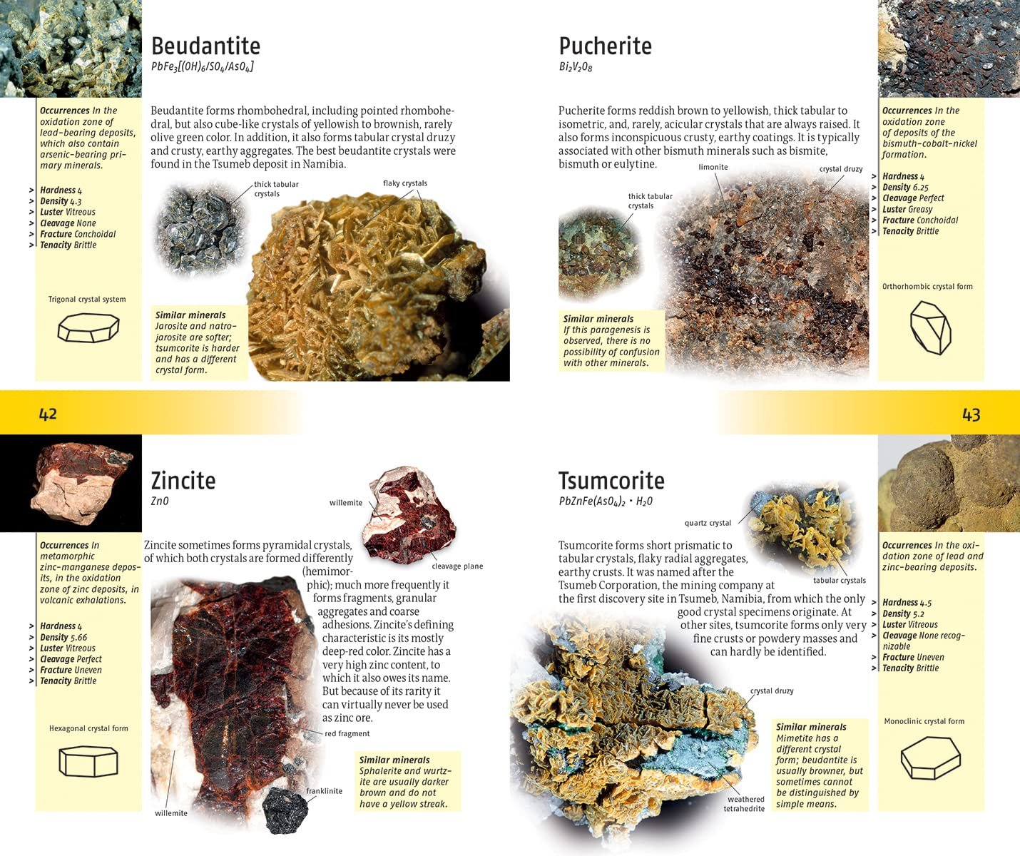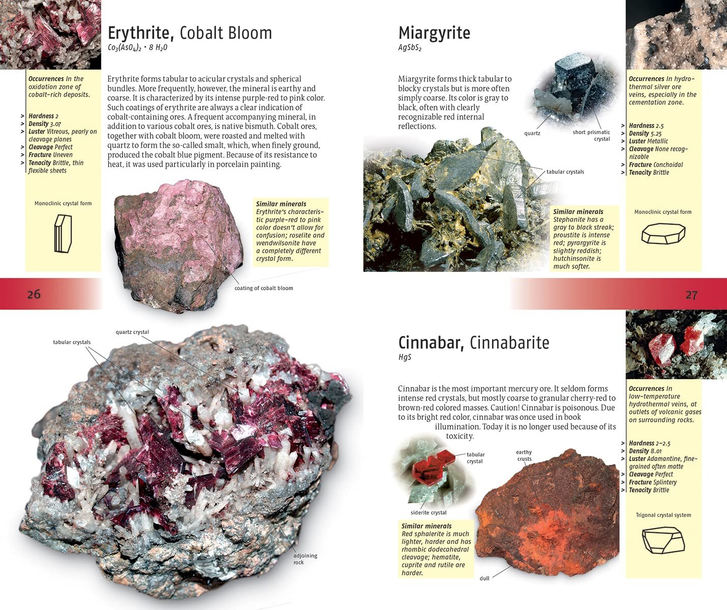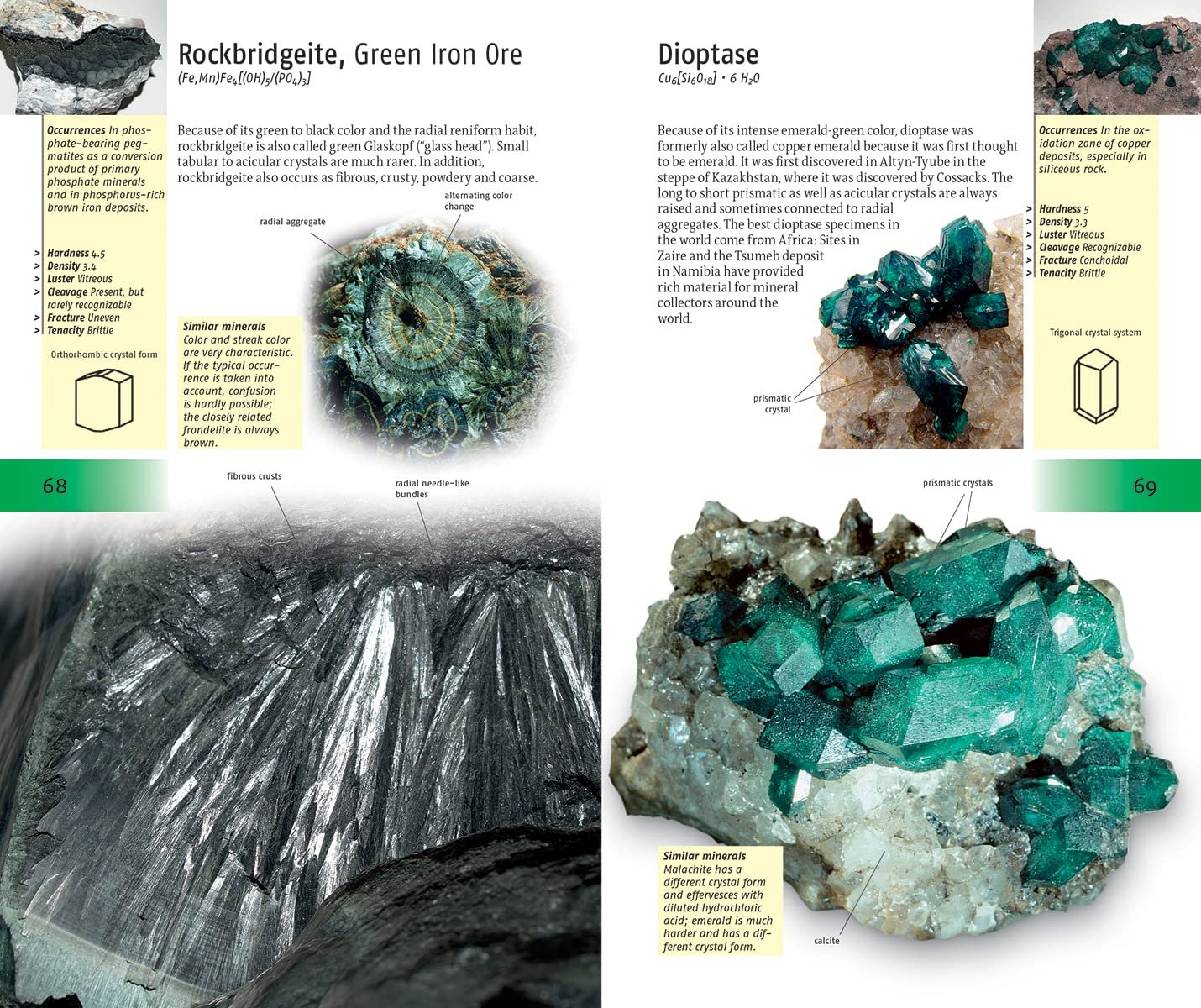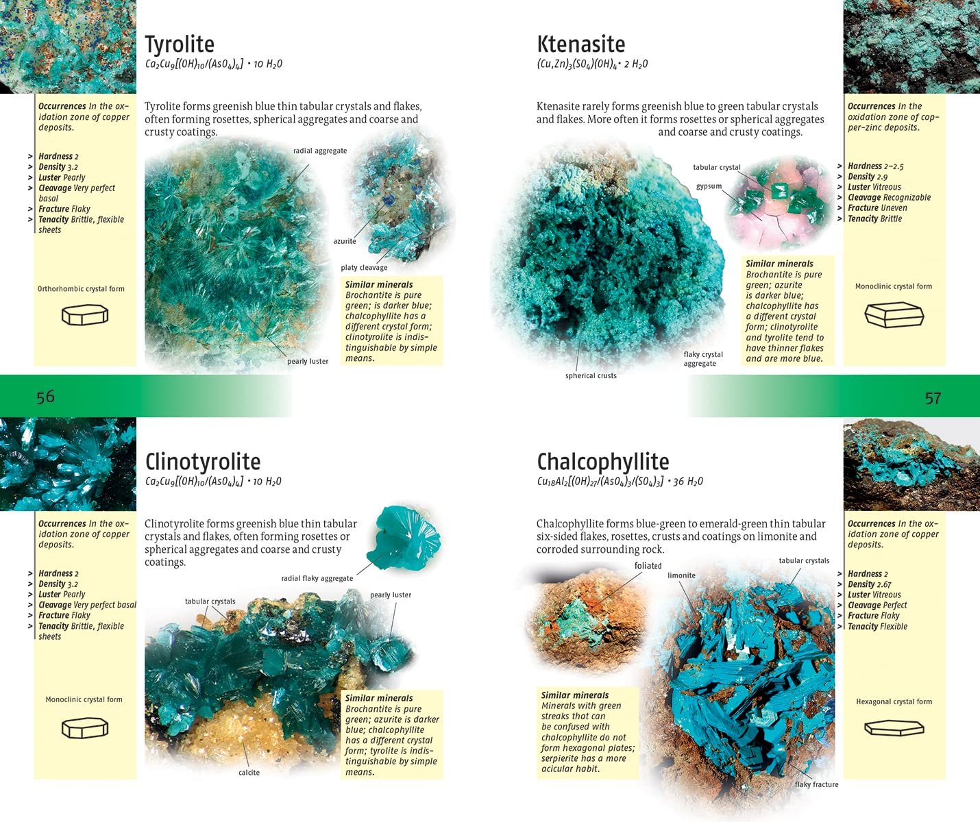 Identification is then further narrowed down with respect to Crystal form, Hardness, Luster, Density, Cleavage, Break and Tenacity. Each rock’s main photograph shows the general or typical view, and identification tips about features are noted in the margins of the respective page.