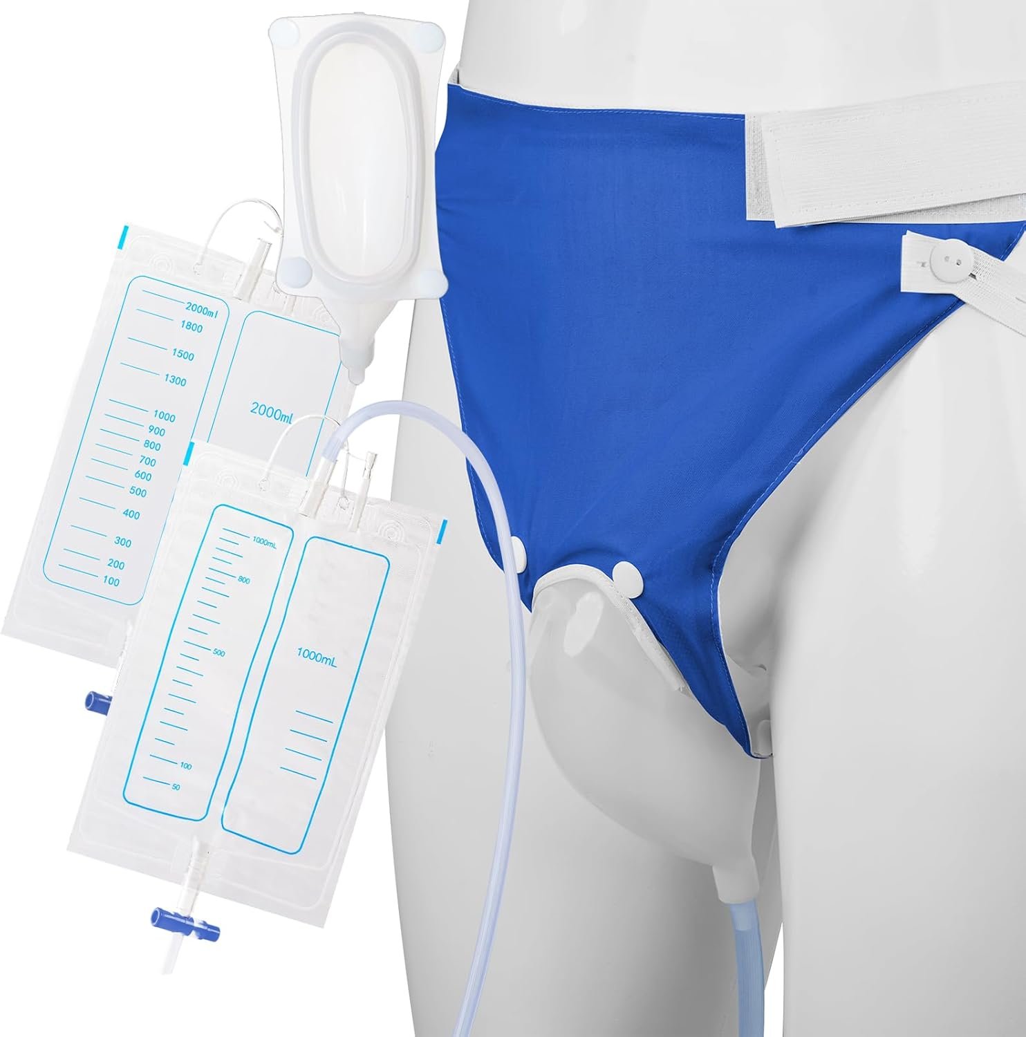 Wearable Urine Collector Set for Men with Soft Cotton Pants 2000ml Night Bag 1000ml Day Bag Silicone Collection Cup and 1.2M Flexible Tube for Daily Comfort Travel or Outdoor Use, Elderly Men Blue