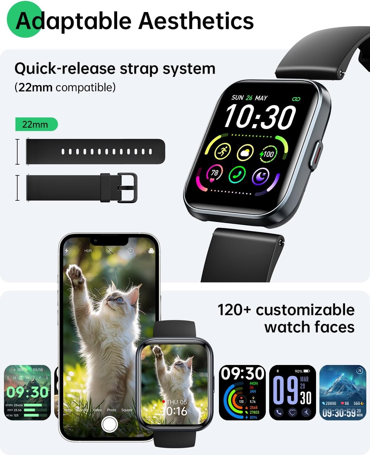 【120+ Watch Faces & Customizable Bands】This Fitness Watches for Women has Personalised dial: classic numbers, minimalist lines, anime IP, 120+ styles change in a Second. 22 mm Quick release bands: silicone,nylon,leather,business, sports and leisure style in a second