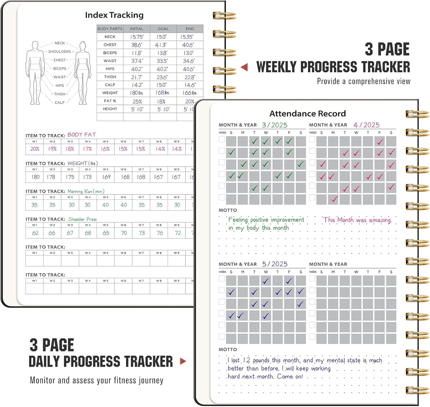 Portable and easy to write: With dimensions of A5 (6.1 inches x 8.3 inches), this fitness log can fit well in your bag. It has an elastic band, a pen ring and double pockets for convenient writing and organization