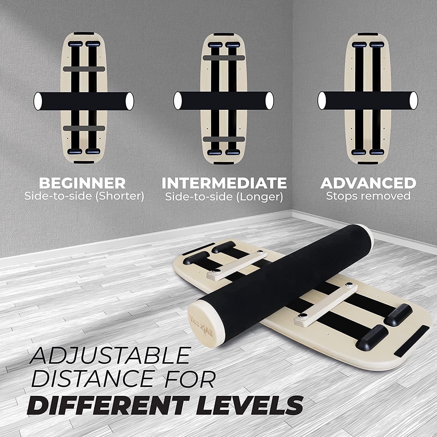 EASILY CUSTOMIZABLE: Balance surf board allows for easy adjustment of distance with 2 removable stoppers; Standing desk balance board offers options of 11, 16, and 22 inches for beginners or removal for advanced riders